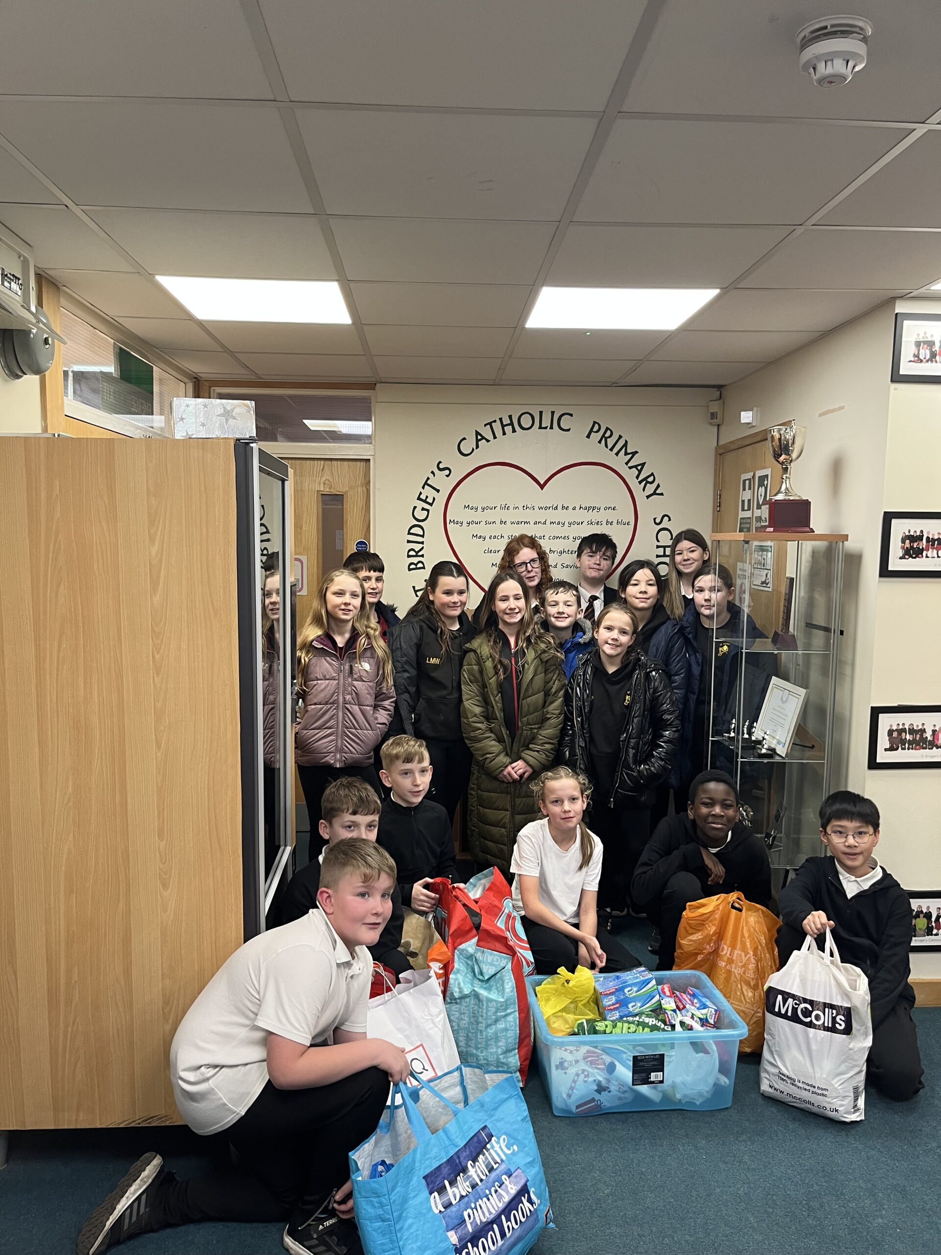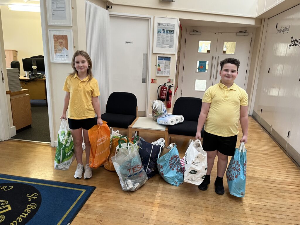 Cardinal Newman Chaplain, Louise James, who was overseeing the collection and delivery of the bags with support from the students, said ‘it has been amazing to see that every single school invited to participate has collected so much to support those in need. We are really moved by how enthusiastically the students have responded’ Helen Lea, Headteacher of St. Peter’s primary school, added ‘this is just one of the events that the Catholic schools across the town have planned for the Year of Jubilee. We have a wonderful community of students, parents and staff in our Warrington schools and we work together incredibly closely. Thisis just one of the ways in which we hope to make a positive impact to the town as we respond to Pope Francis’ call and we are so grateful to the support of our families with this event.’ The schools involved in the project were: