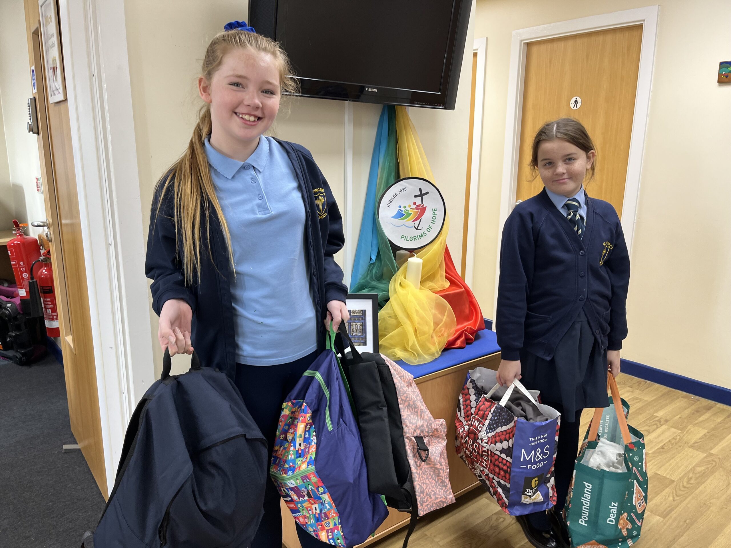 Headteachers of 16 of Warrington’s Catholic schools have been blown away by the scale of donations their school communities have made to their ‘Hope in a Bag’ project this week which kicked off the Year of Jubilee in the town. Organised by the SVP societies of Cardinal Newman Catholic High School and St. Peter’s RC Primary school, all 15 Catholic primary schools from across Shrewsbury and Liverpool Dioceses have been collecting items such as sleeping bags, toothbrushes and toiletries that will be of use to those who are without permanent accommodation. These donations have then been put into rucksacks so that they can be given to those who are without a home.