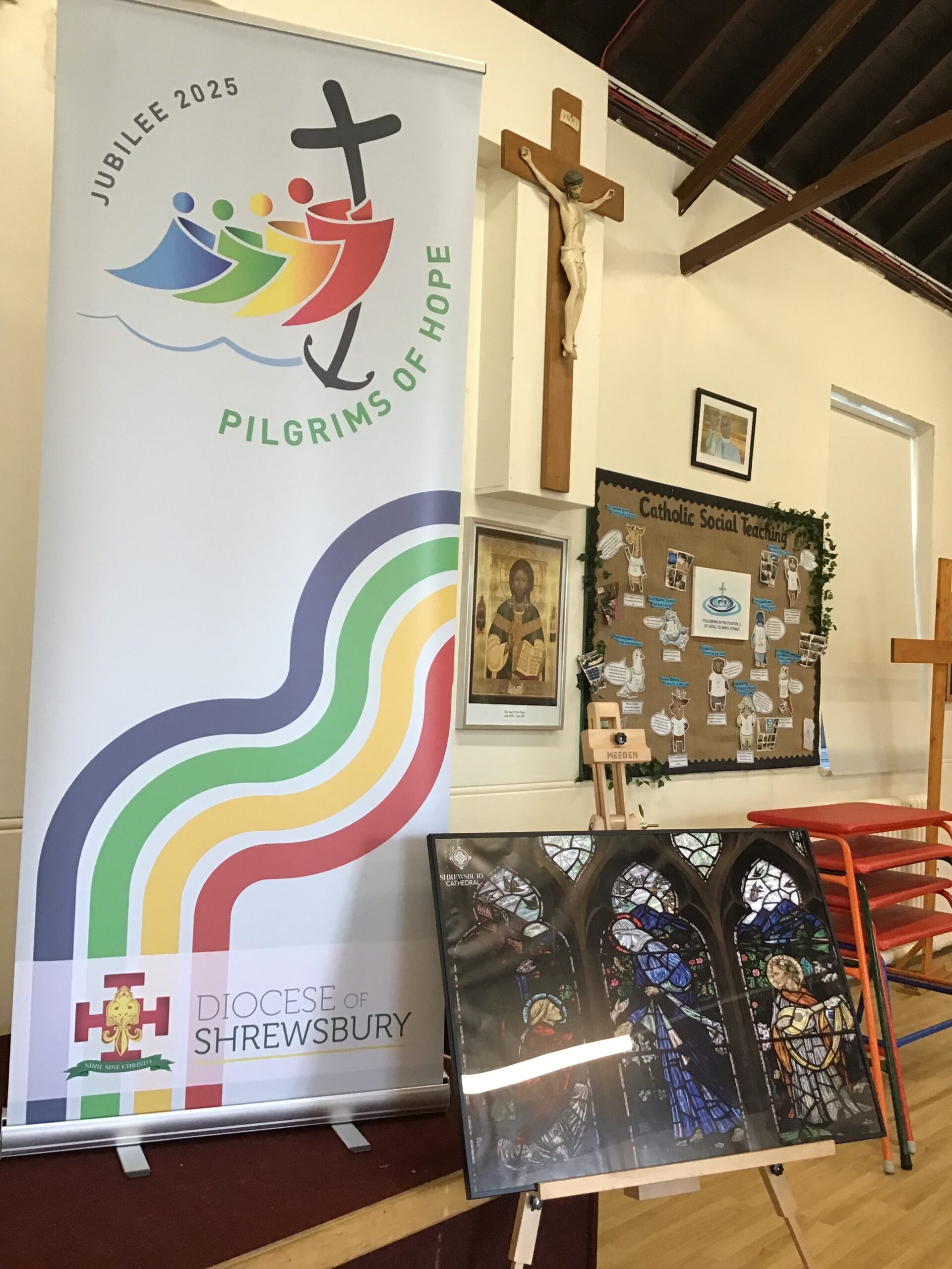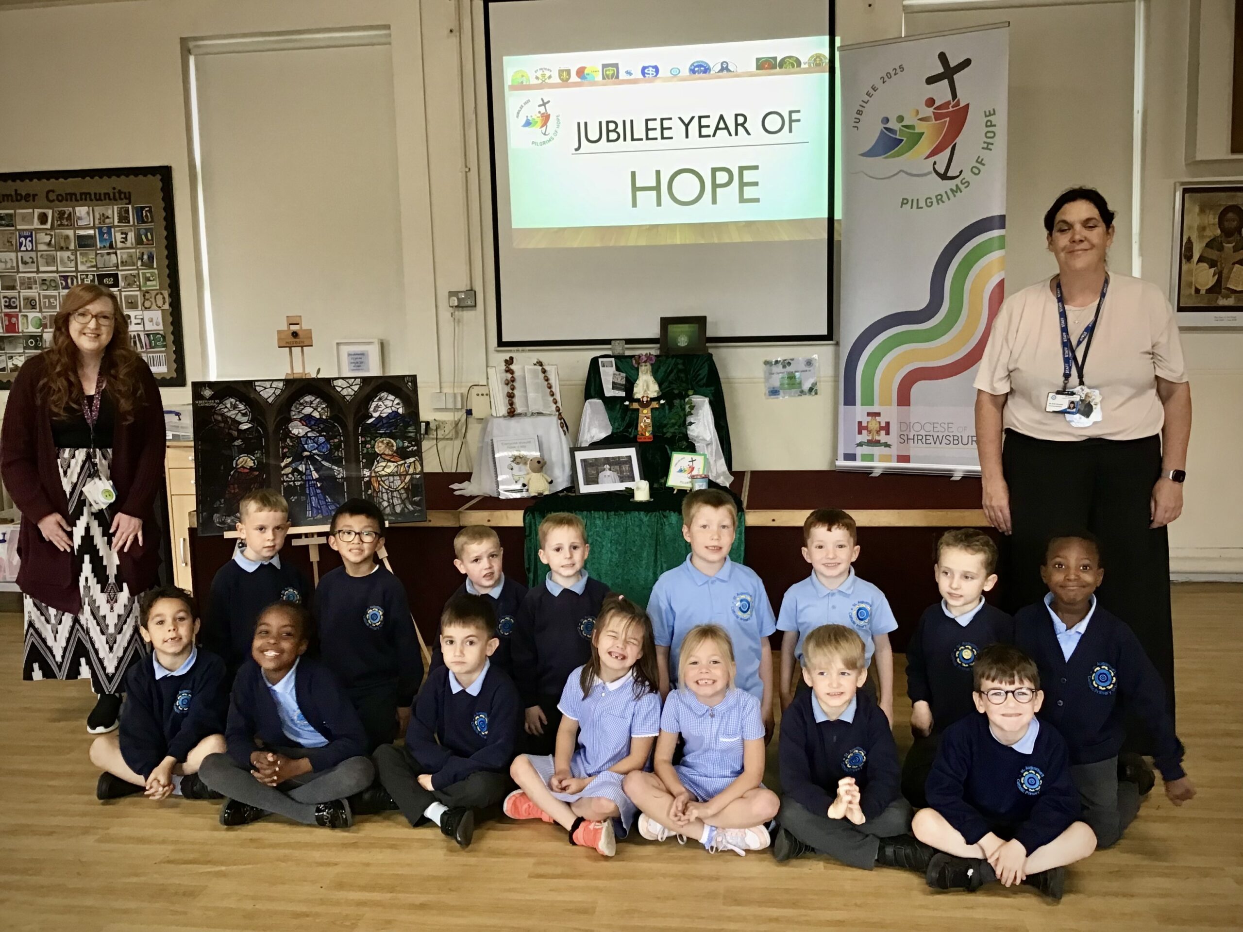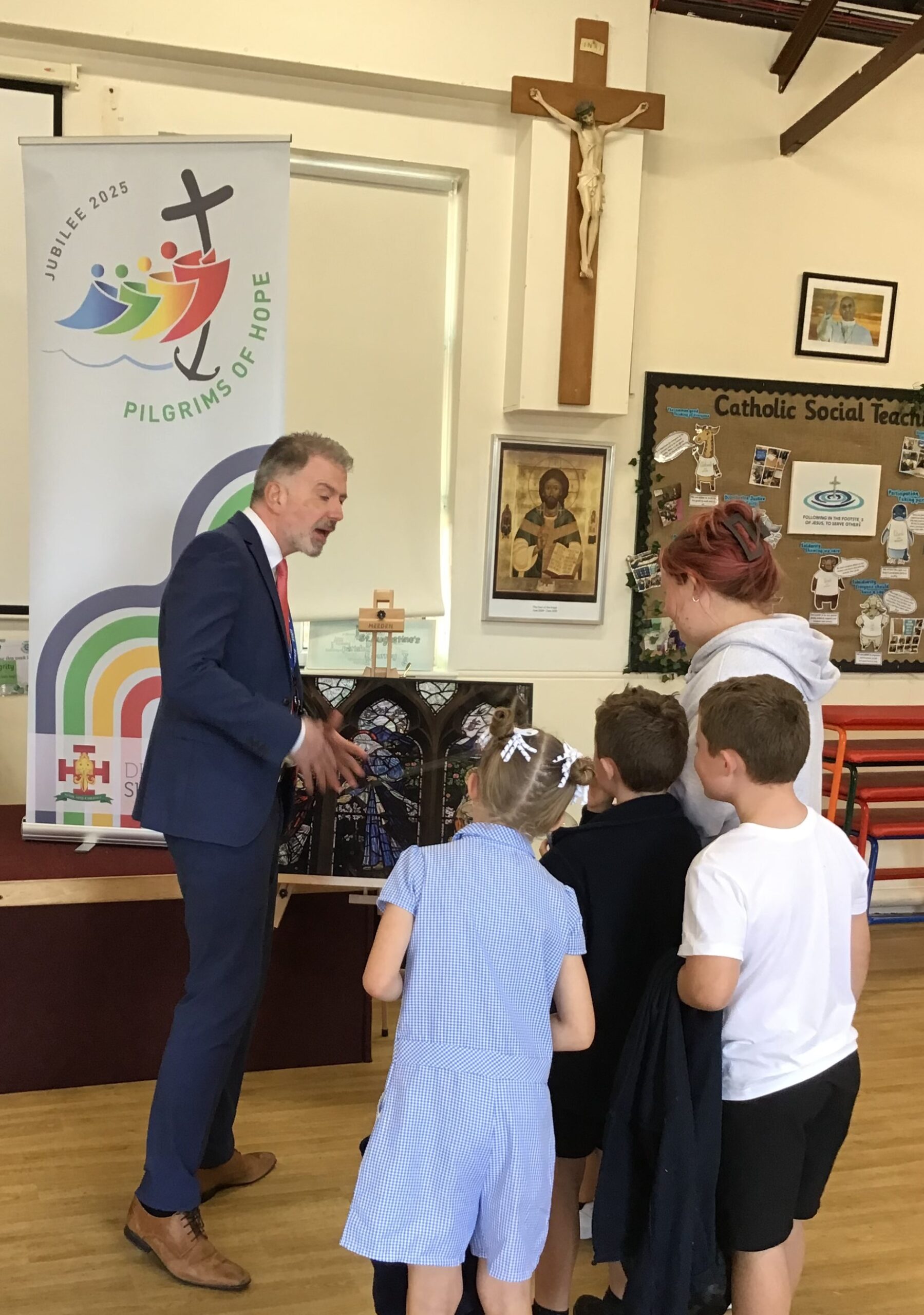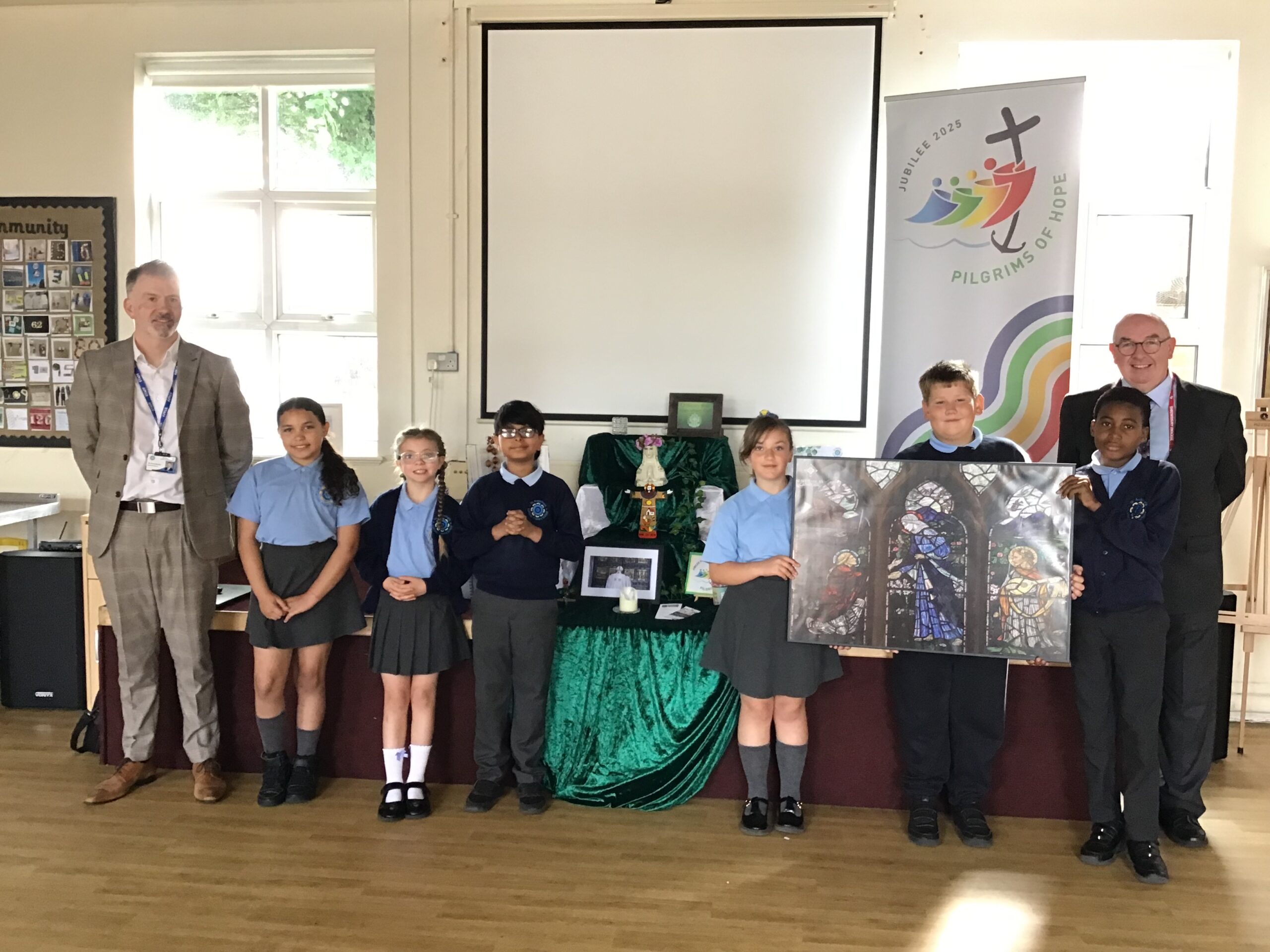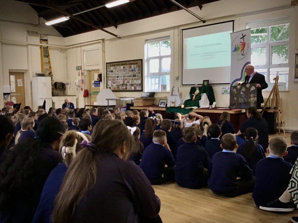 On the morning of Monday 9th June, the community of St Augustine’s were thrilled to be the first to welcome the Jubilee Icon of The Visitation, blessed by Bishop Mark, into our school. We gathered as a whole school for Celebration of the word and our RE ambassadors were proud to be the first children to receive the icon on it’s pilgrimage.