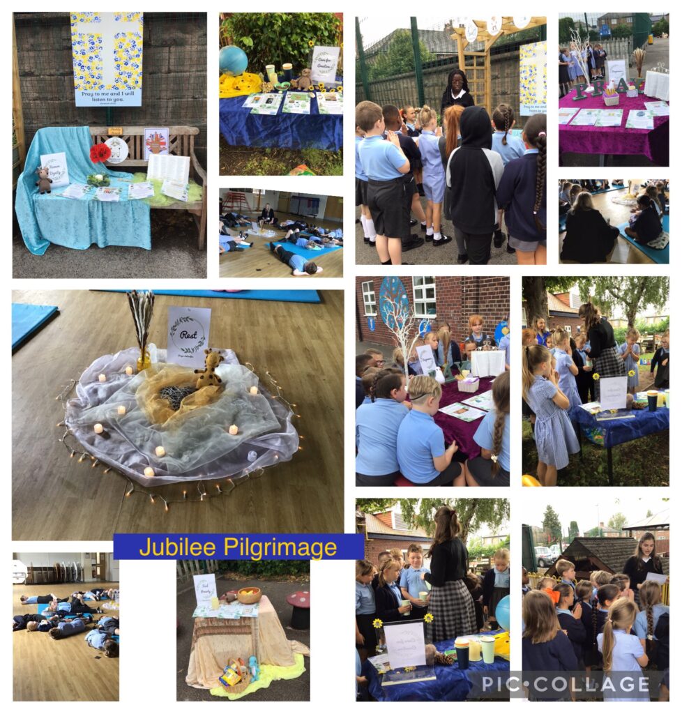 On Wednesday 25th June, Mrs Rees and Mrs O’Hara were thrilled to welcome all the children at St Augustine’s on their ‘Jubilee Year of Hope’ Pilgrimage. As each class journeyed around our school grounds, they reflected on our catholic social teaching beliefs, focusing in particular on stewardship, preferential option for the poor and human dignity. We reflected on how we can live out our school mission statement ‘Following in the footsteps of Jesus to serve others’ in relation to caring for creation, food poverty, distributive justice and forgiveness. All our children valued this opportunity to journey together in reflection and prayer, with the theme of hope being a key message along our pilgrimage.