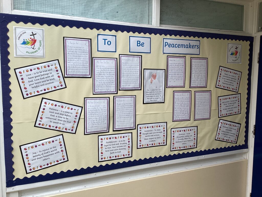 Y2 – have focused on how to be peacemakers and have written prayers of peace for Pope Francis and Bishop Mark. They have also come up with their own definitions for our school value, based on the gifts of the Holy Spirit.